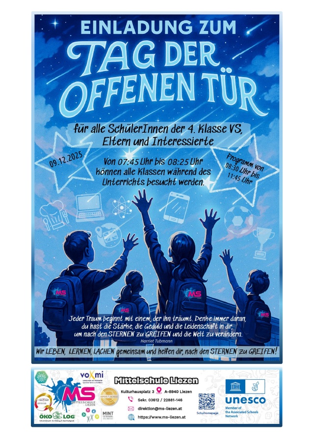 Einladung zum Tag der offenen Tür für alle SchülerInnen der 4. Klasse Volksschule, Eltern und Interessierte.