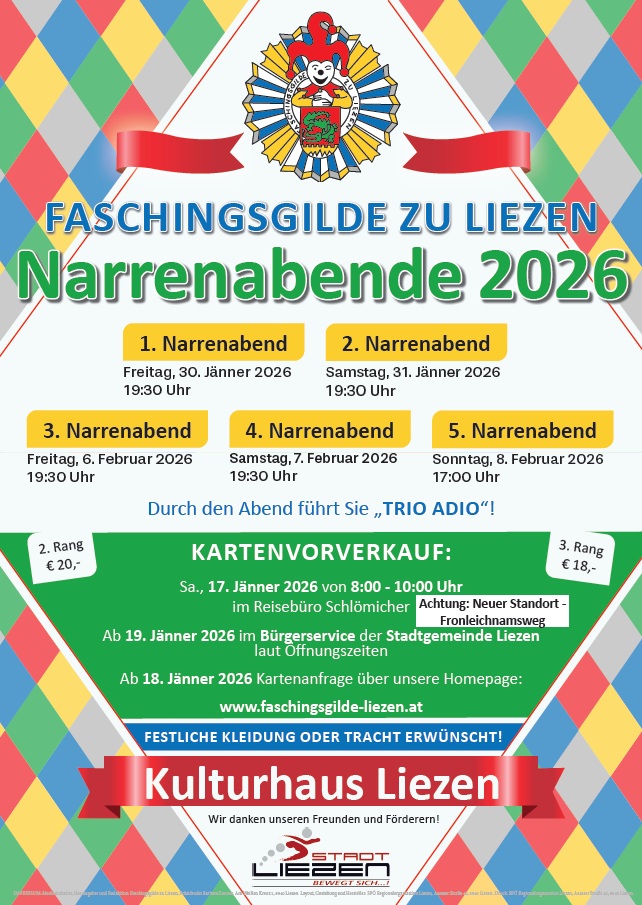 ab 18. Jänner 2026: Kartenanfrage über die Website www.faschingsgilde-liezen.at